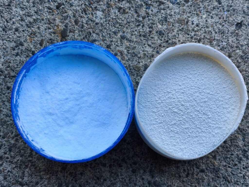 こちらの写真は、LED光源下でのワイシャツ用洗剤(左)と、酸素系漂白剤(右)。ちなみに右の漂白剤は過炭酸ナトリウムという物質で、オキシクリーンとか粉末ワイドハイターの主成分。